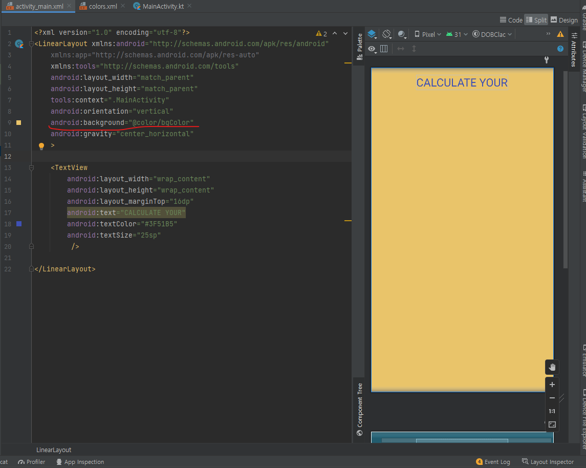 일단 ContraintLayout 의 속성의 이름은 기본적으로 layout_constraint로 시작함.