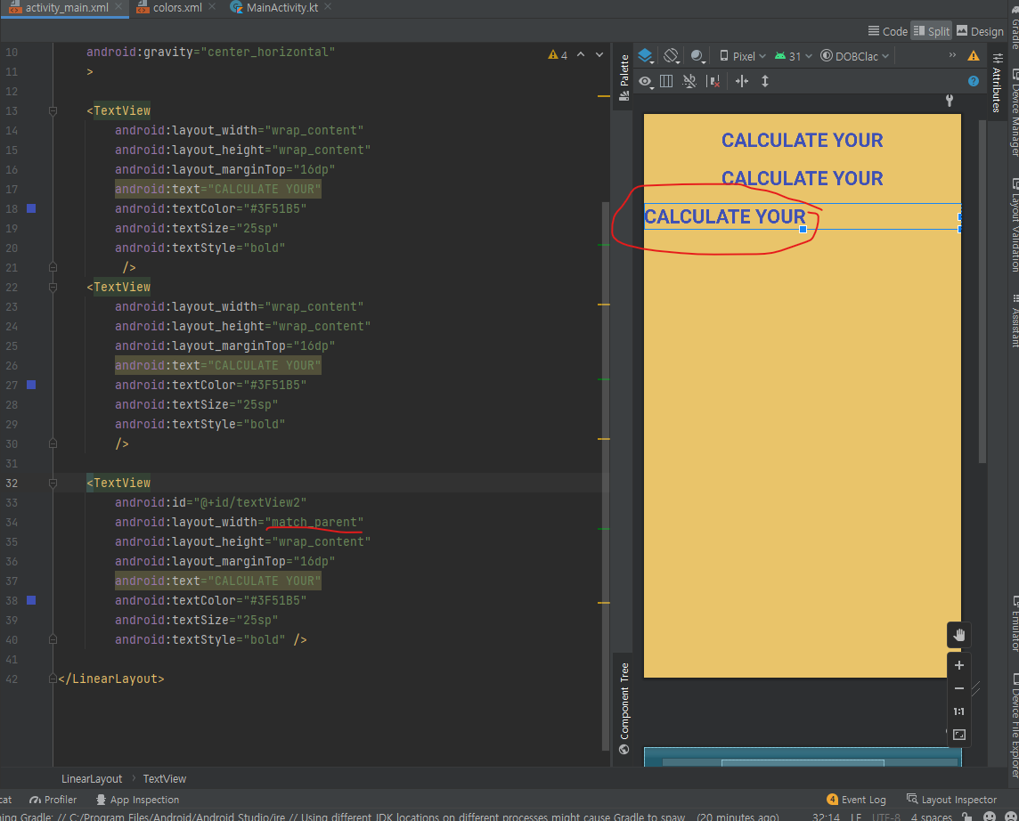match_parent 로 했을 때와 wrap_content로 설정했을 때의 차이를 볼 수 있다.