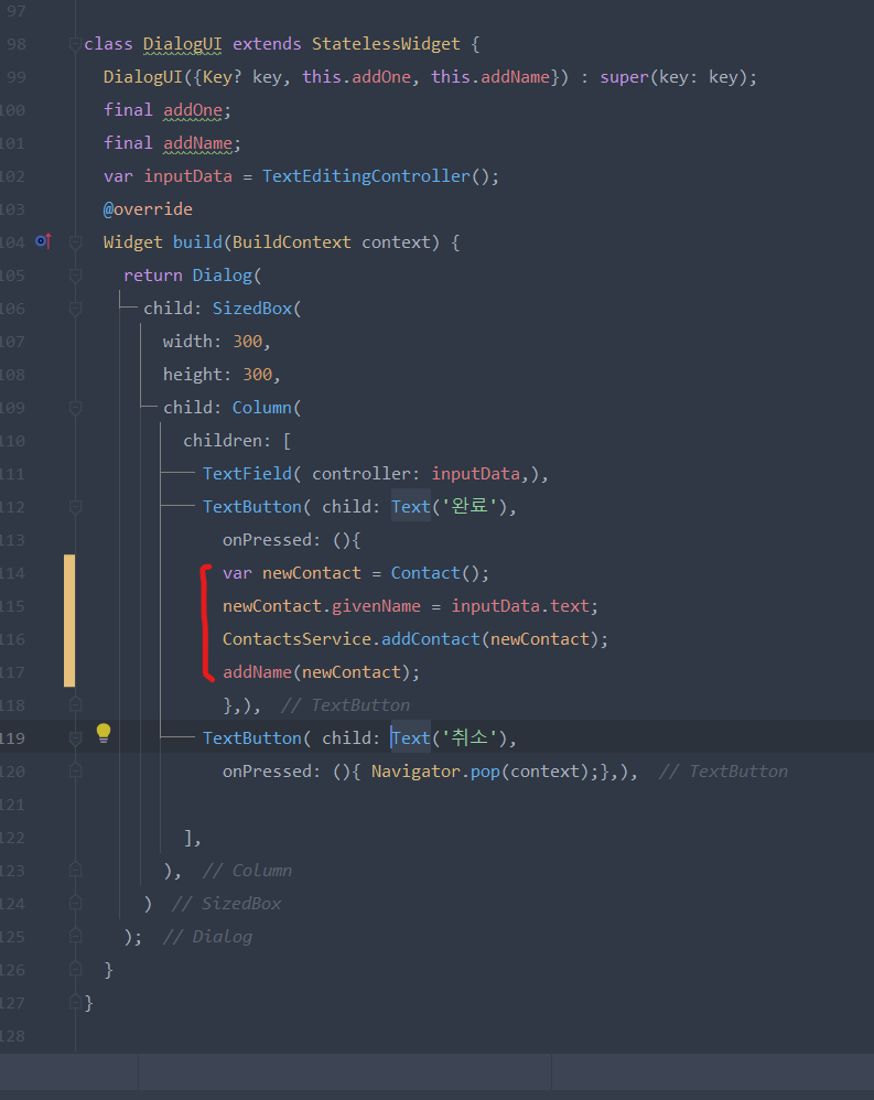 contacts 라는 변수에 패키지 사용법에 따라 await ContactsService.getContacts(); 라고 작성해줬다.