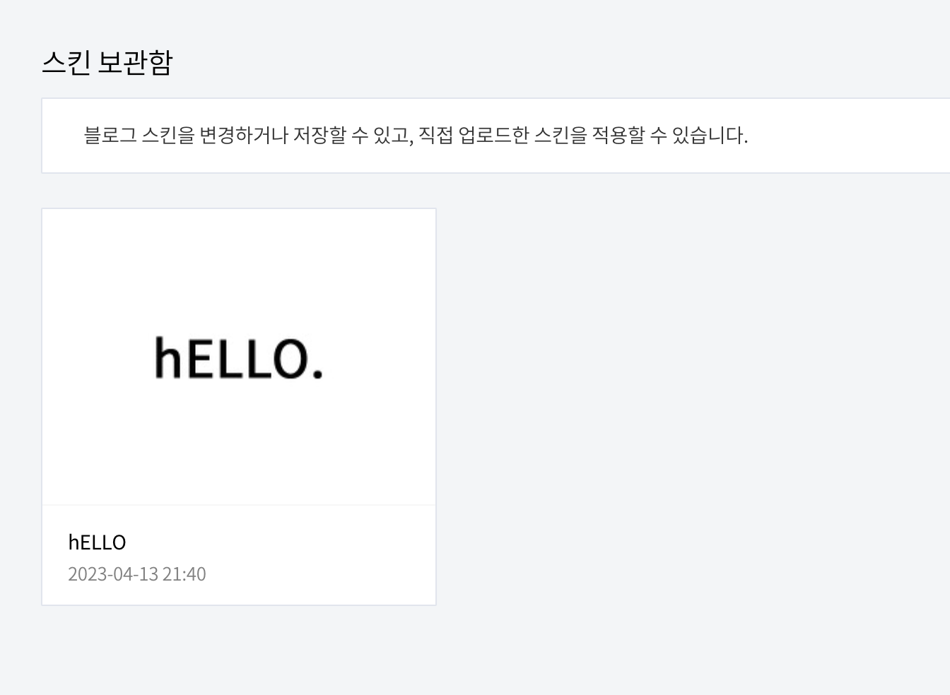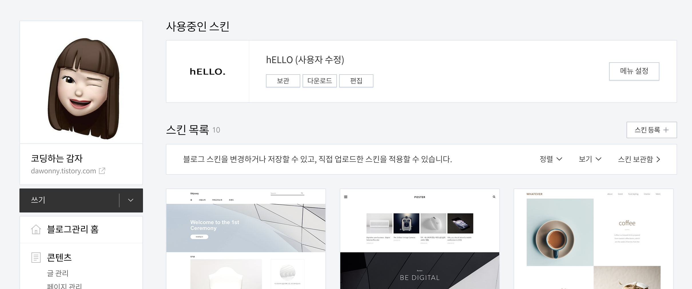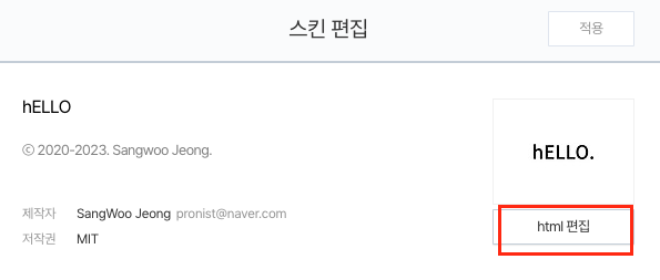 일단 저는 hELLO 라고 하는 스킨을 적용했습니다.