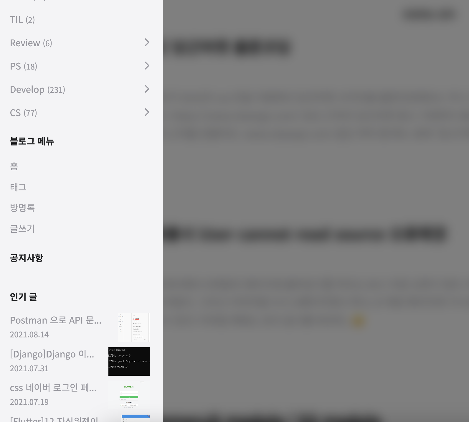 사이드바를 펼치면 블로그 메뉴에 글쓰기 버튼이 생긴 것을 확인하실 수 있습니다.