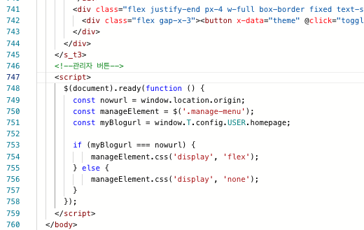 방문자들에게는 보이지 않는 별도의 글쓰기, 관리 버튼을 생성하고 싶으신 분들은 더 스크롤을 내려서 [글쓰기 / 관리 버튼 별도로 만들기] 섹션의 내용을 확인해주세요!