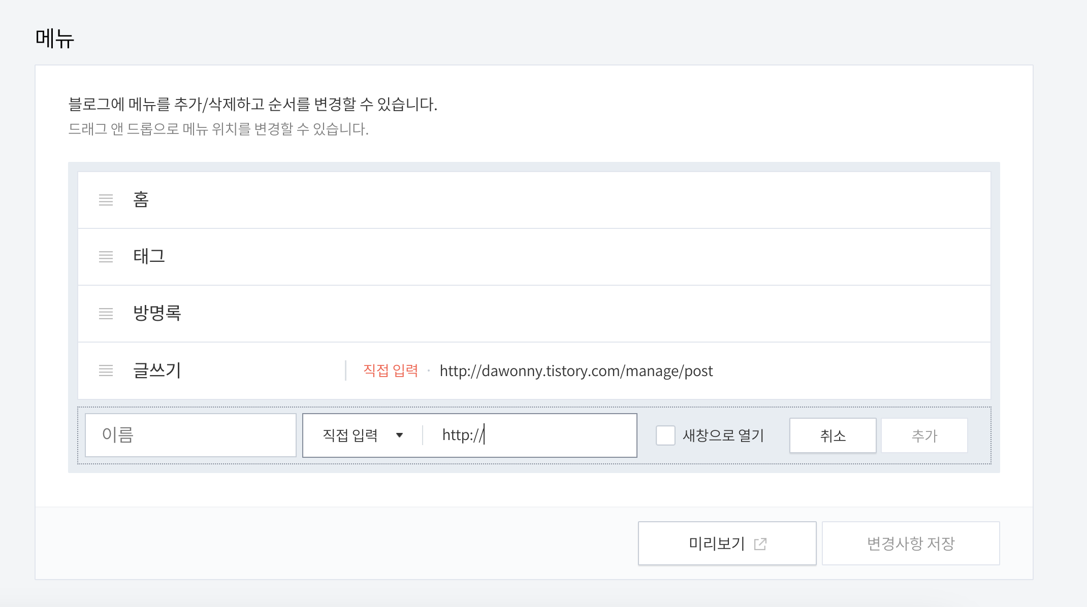 블로그 설정 > 메뉴 에 들어갑니다