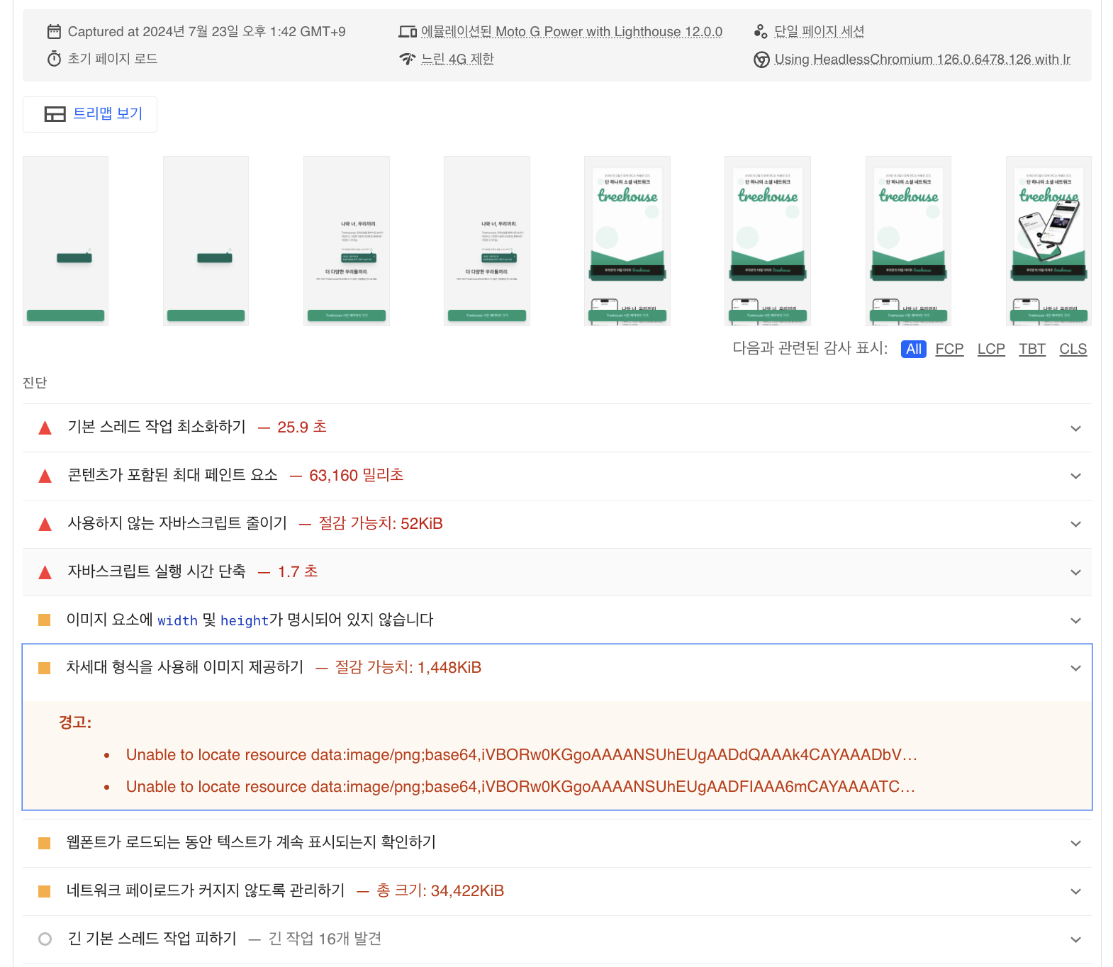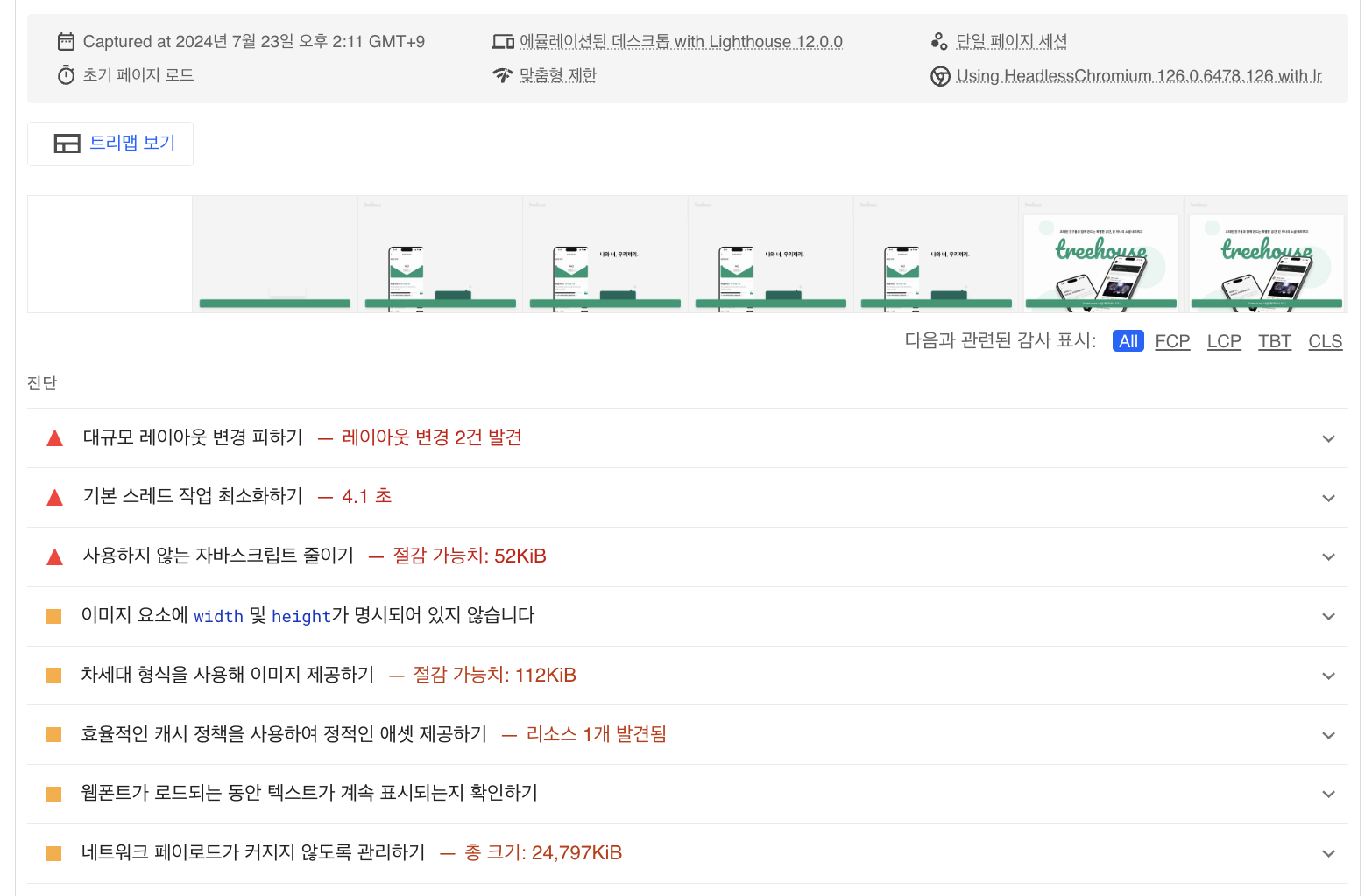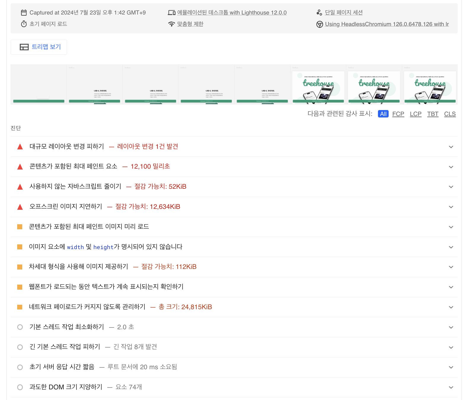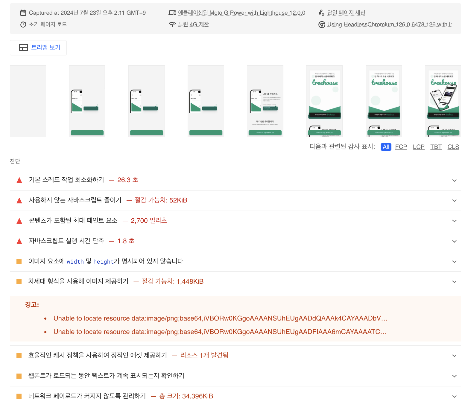 | Largest Contentful Paint | 63.2 초 | 2.7초 | 12.1초 | 0.4초 |