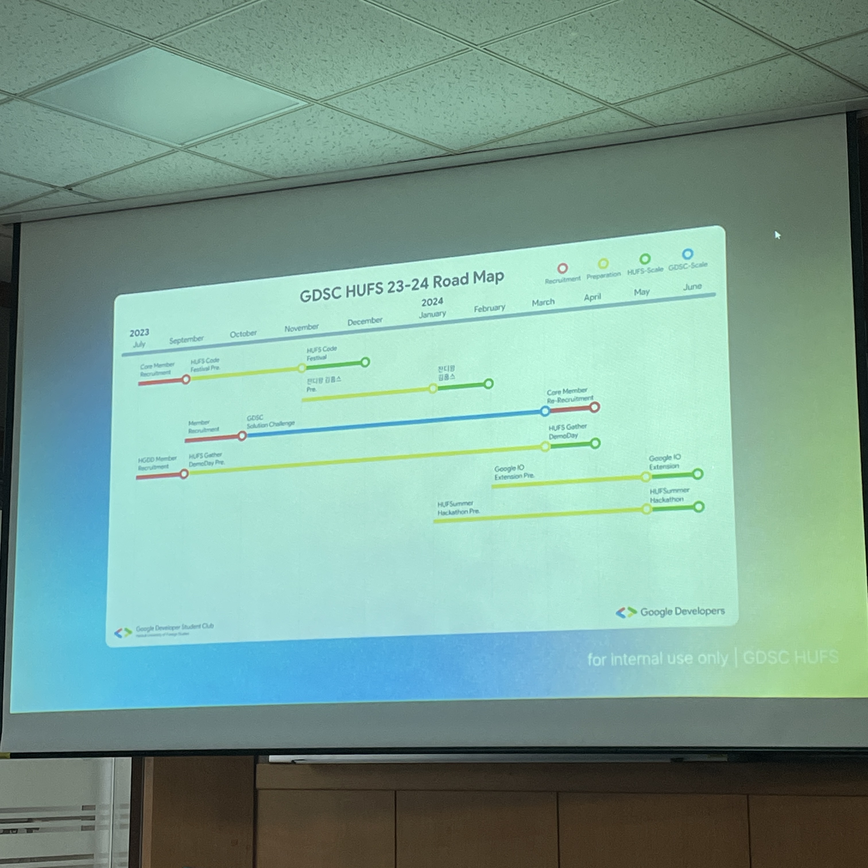 저희 GDSC HUFS 챕터는 1년단위로 활동이 이루어지며, 보통 2학기에 시작을 해서 다음 년도의 1학기 까지 활동하는 것으로 진행되었어요.