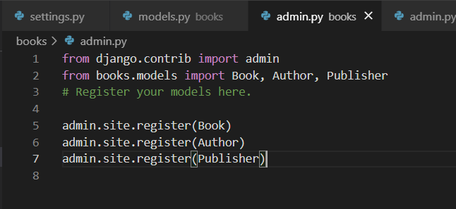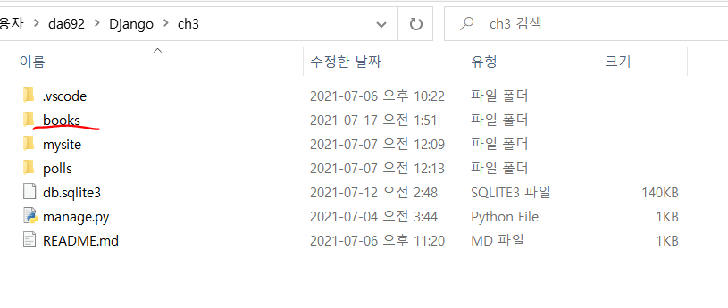 books 애플리케이션은 mysite 라는 프로젝트에 포함되는 거니까 설정파일에 등록을 해야한다.