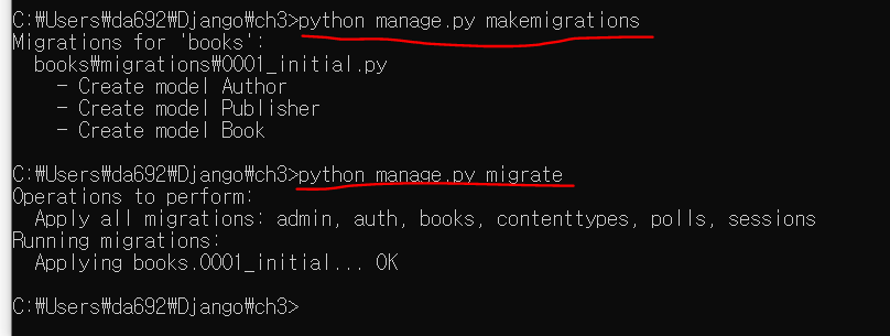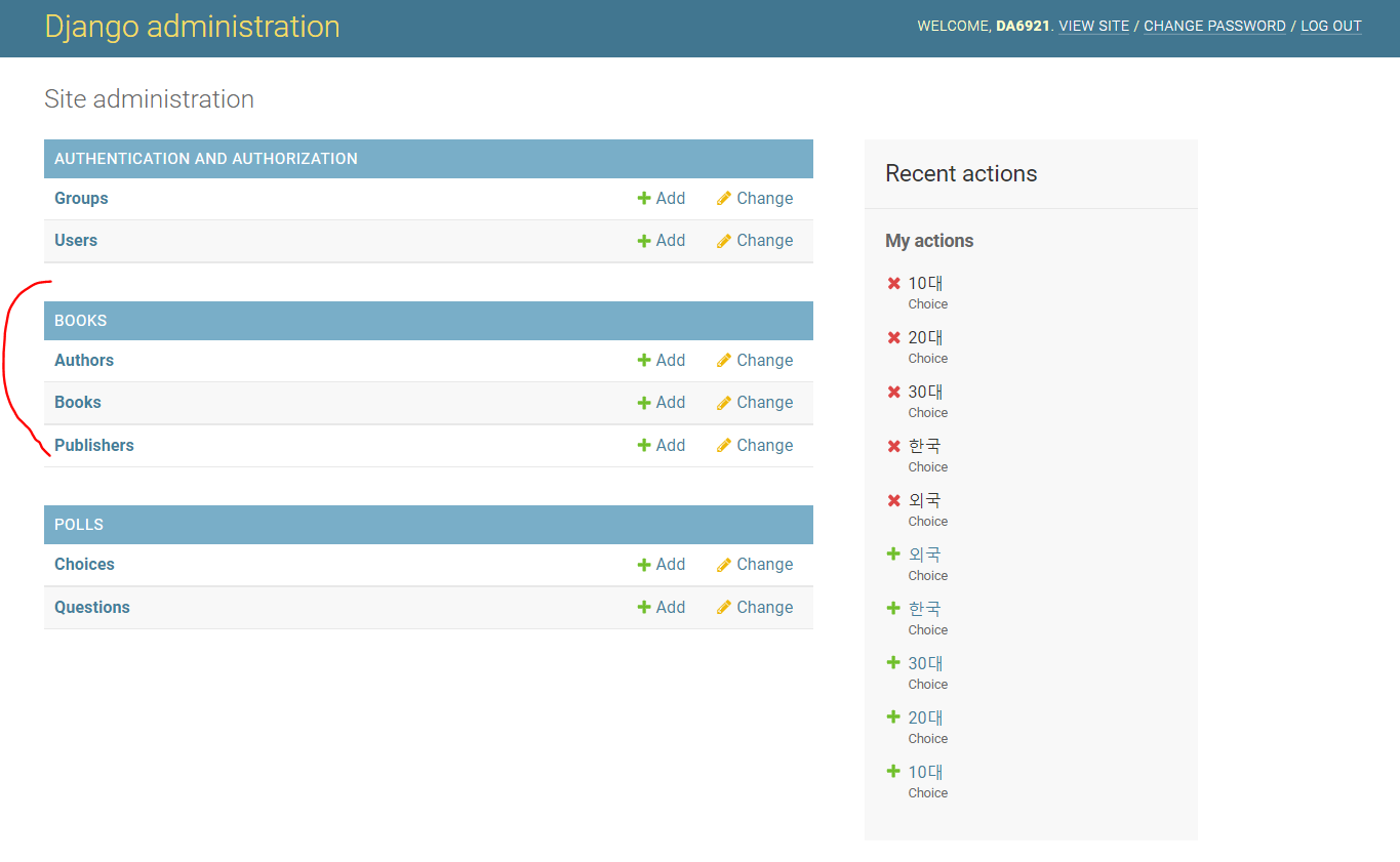 Books 애플리케이션에 만든 테이블들이 잘 반영되어있다.