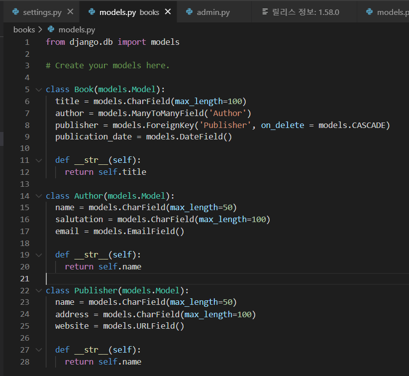 Book, Author, Publisher 이라는 테이블 세개를 코딩해줬다.